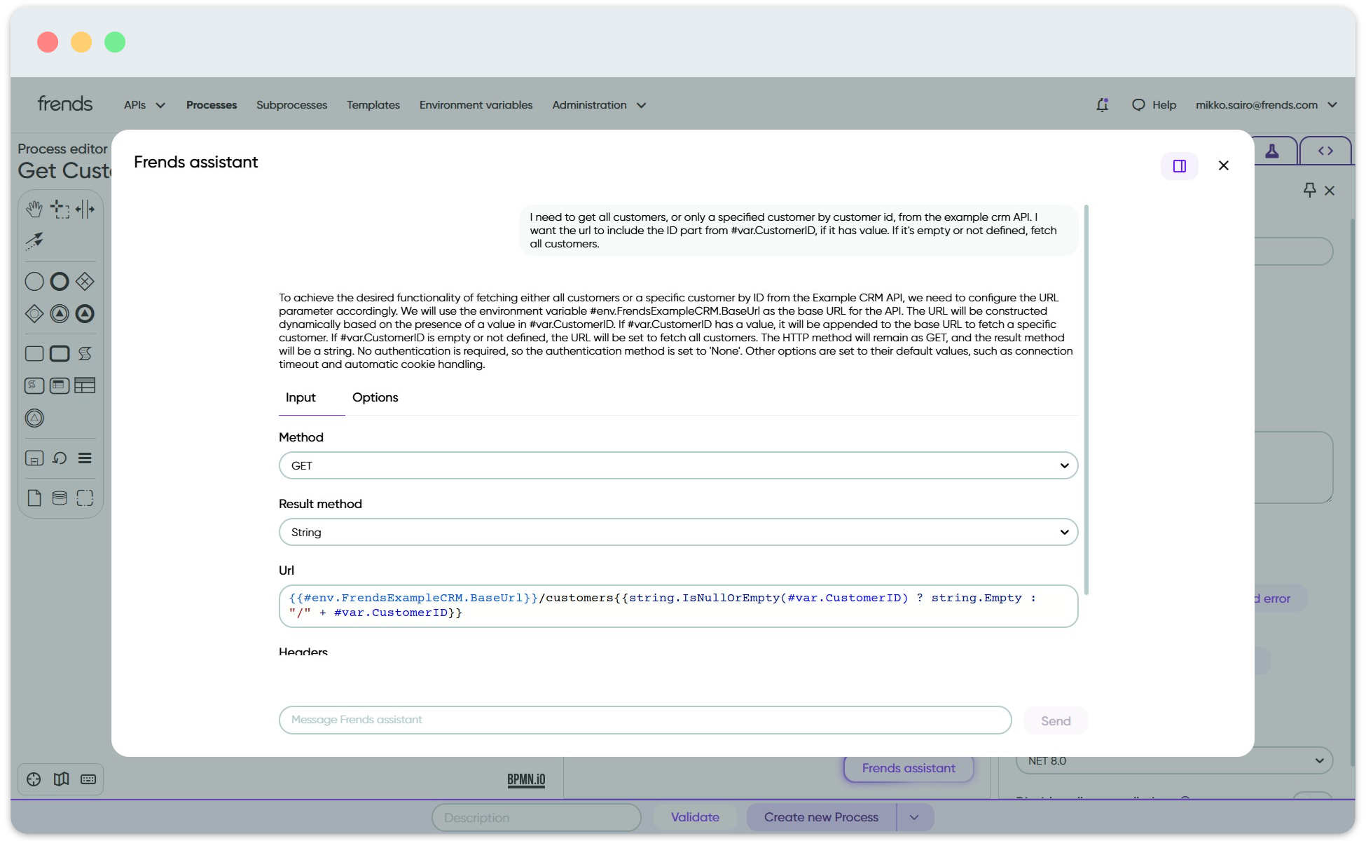 AI in Frends will help you with configuring Tasks as well as create code.