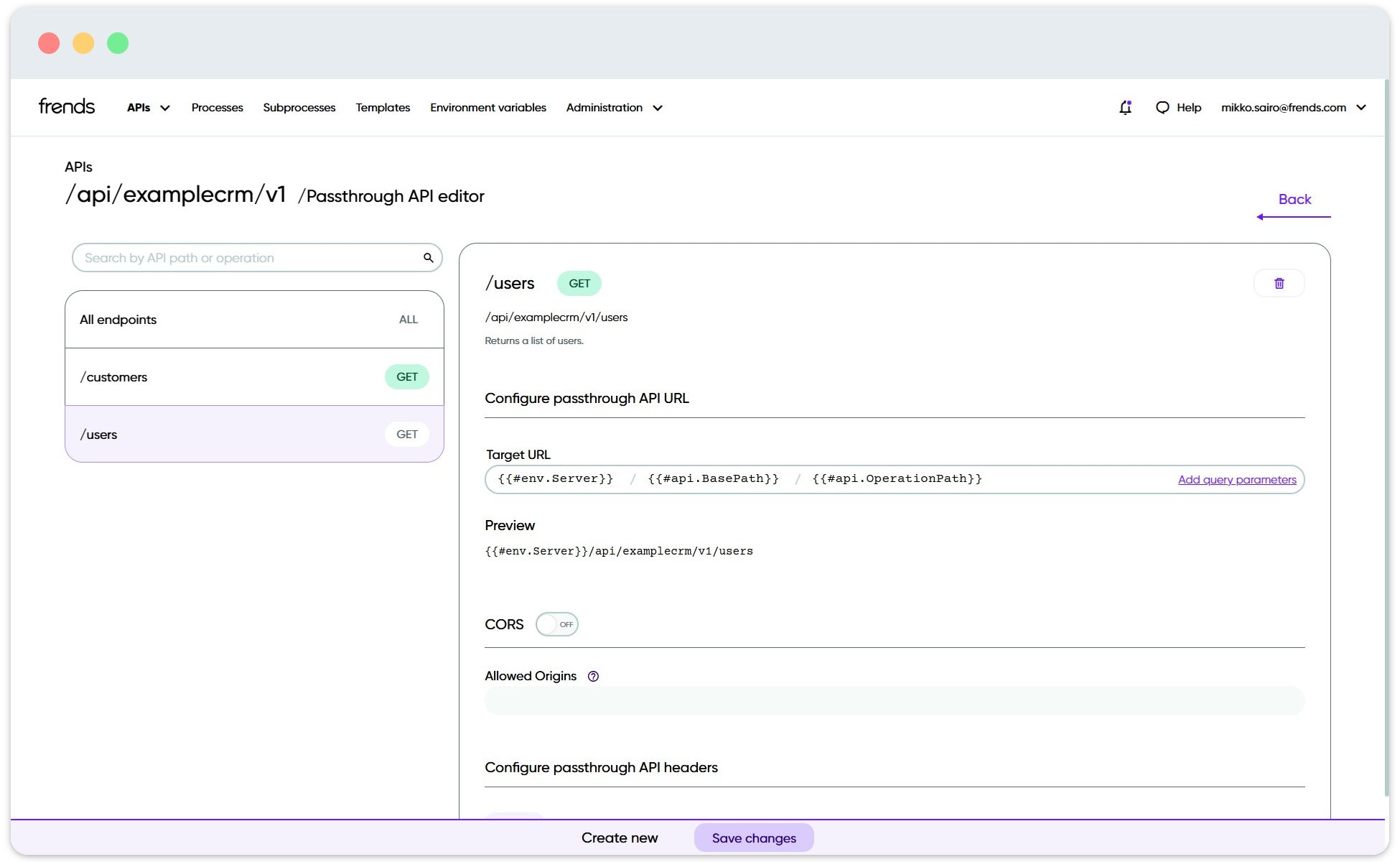 To configure a passthrough API, you need to have created an API to Frends, and then click Create passthrough API button in API management view. In the passthrough API editor, you can specify the target url for each API endpoint, optionally passing along parts of the original request's url or query parameters, as well as manage the headers used in the passthrough.