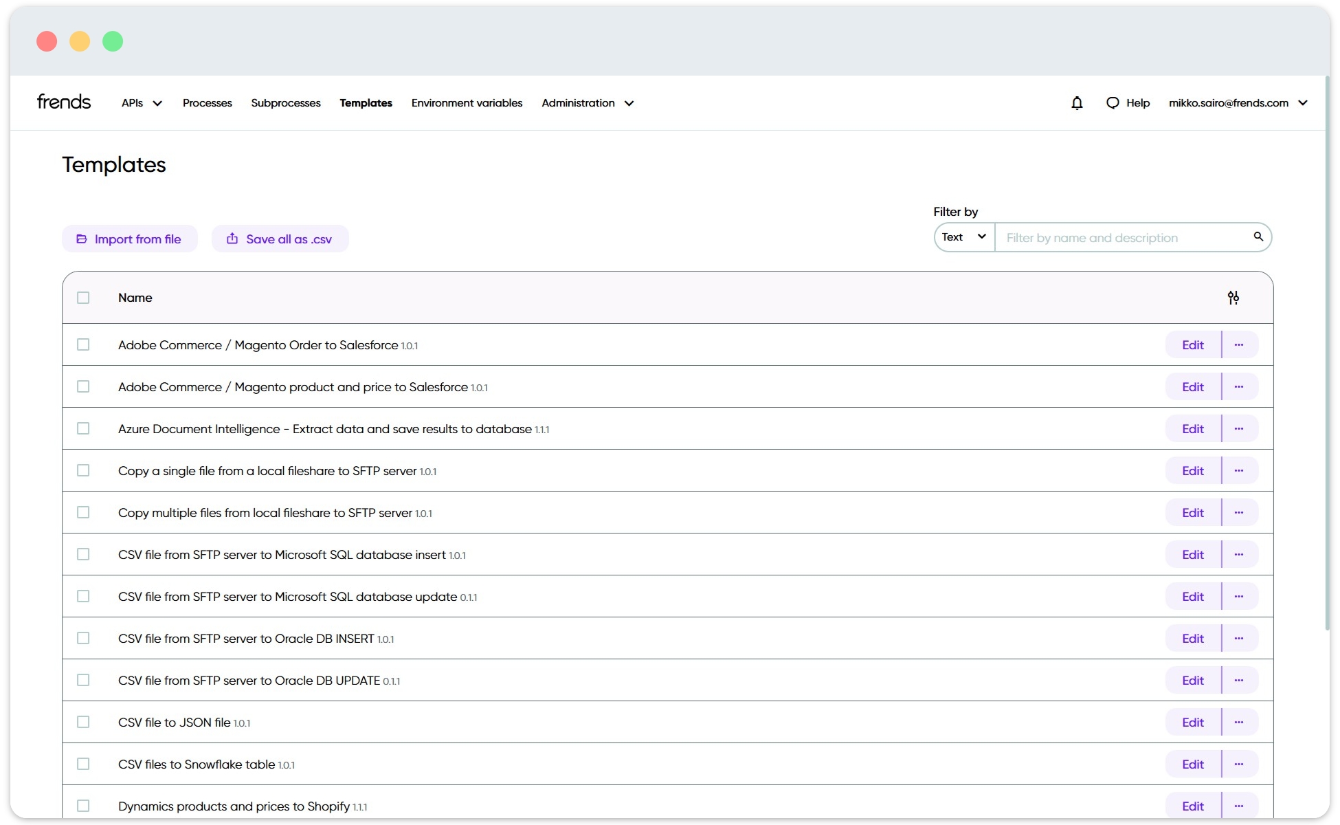 Frends Templates are pre-built structures designed to expedite workflow creation and integration processes. They serve as a blueprint that aids in maintaining consistency and minimizing potential errors. By utilizing these Templates, users can save significant time in setting up new integrations, as they provide a reliable and tested starting point tailored for various common tasks.