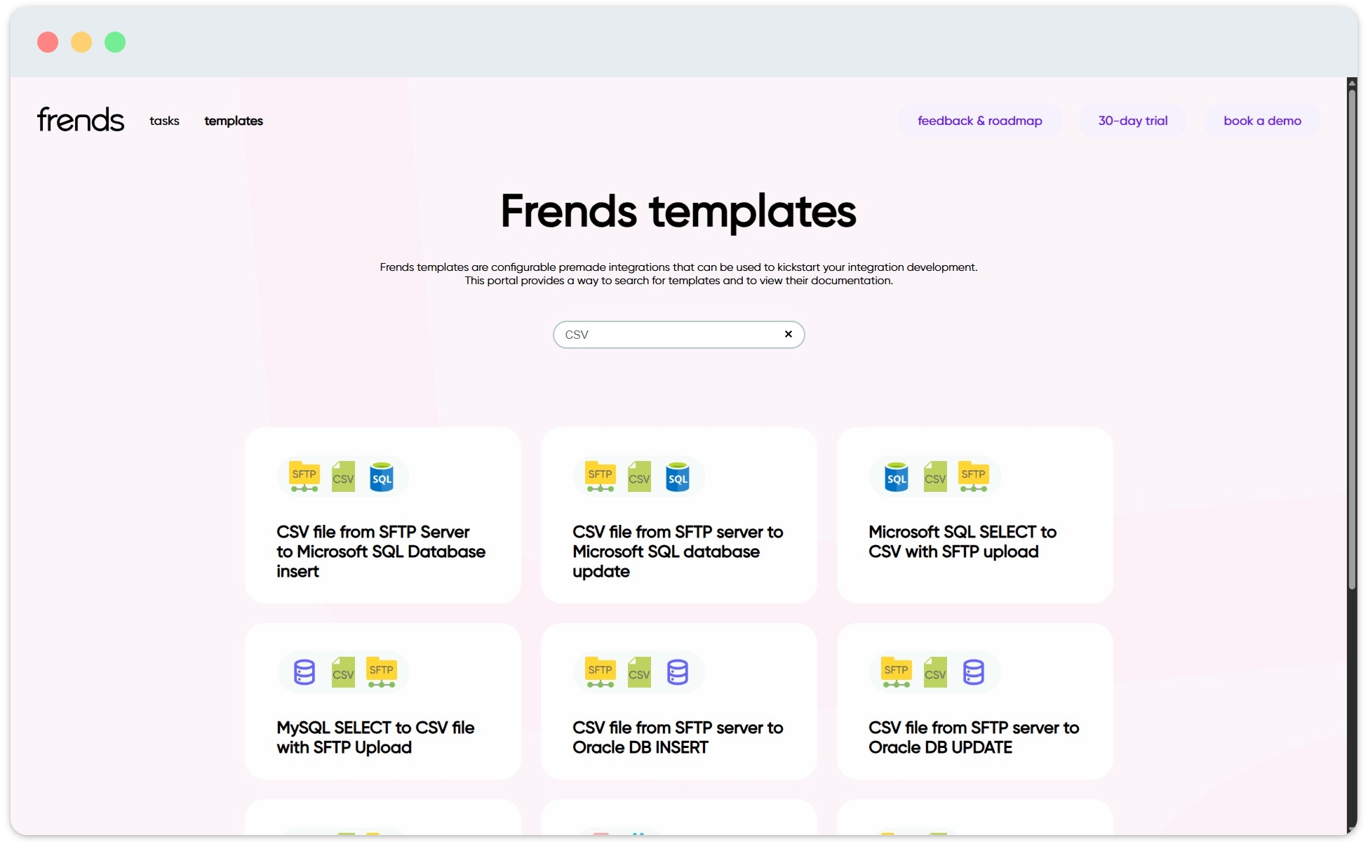 In case your Tenant doesn't yet have a suitable Template for you, you can check out more Templates at https://templates.frends.com. This library is organized by targeted system, making it easy to find Templates relevant to your specific system or Process needs.