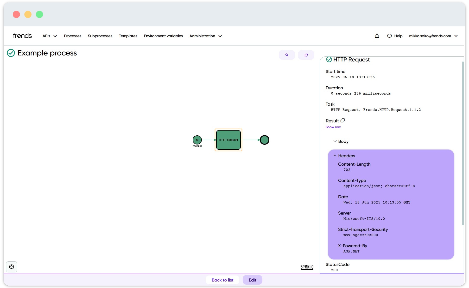 You can view the Process execution and all its steps by opening any of the Process Instances from the list. On a default log level, all the results of each Process Task are logged into the Process Instance. This can be adjusted based on your needs to log more, including the input parameters for each Task and shape. Or less, to focus solely on erroneus executions, to save bandwidth, storage and performance for the actual execution.