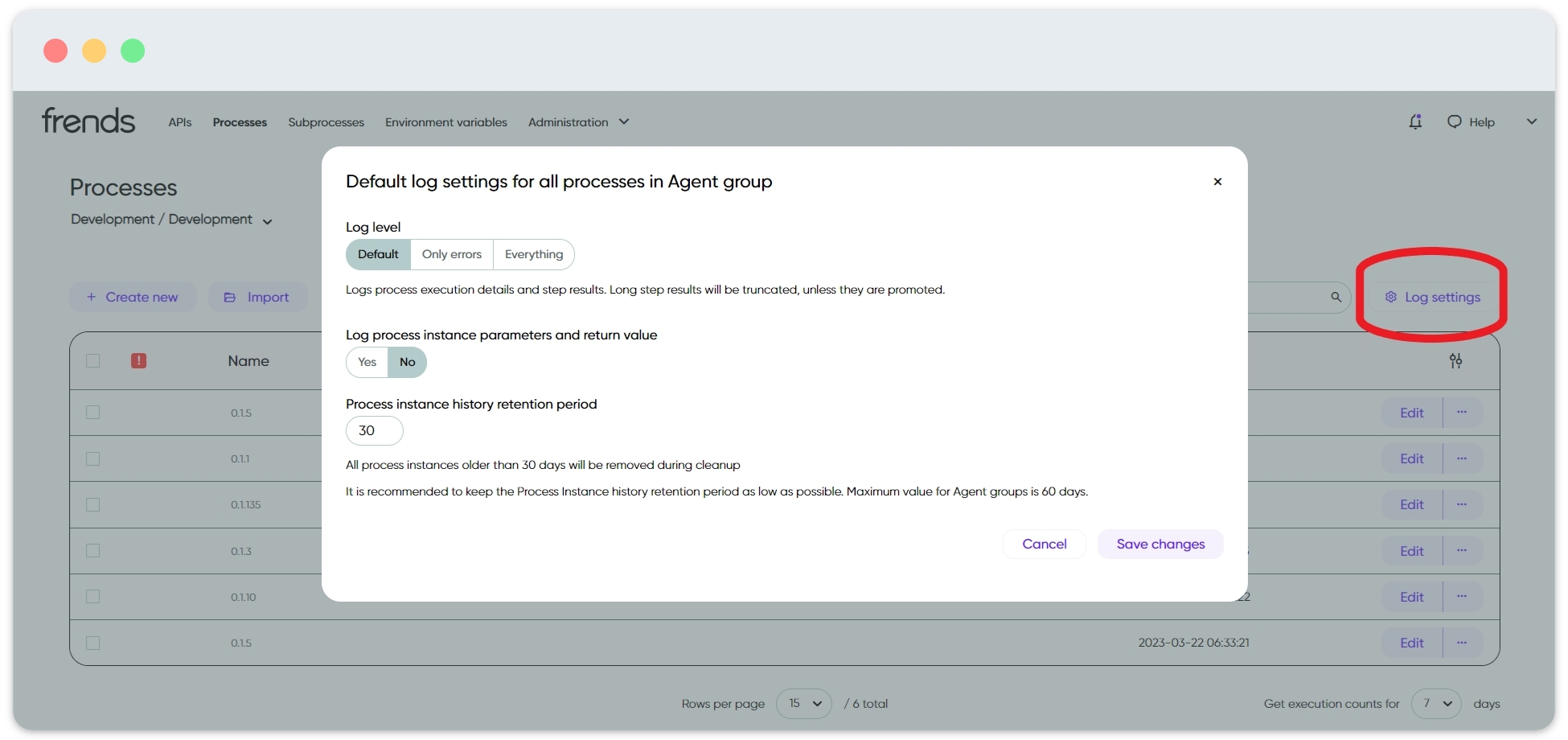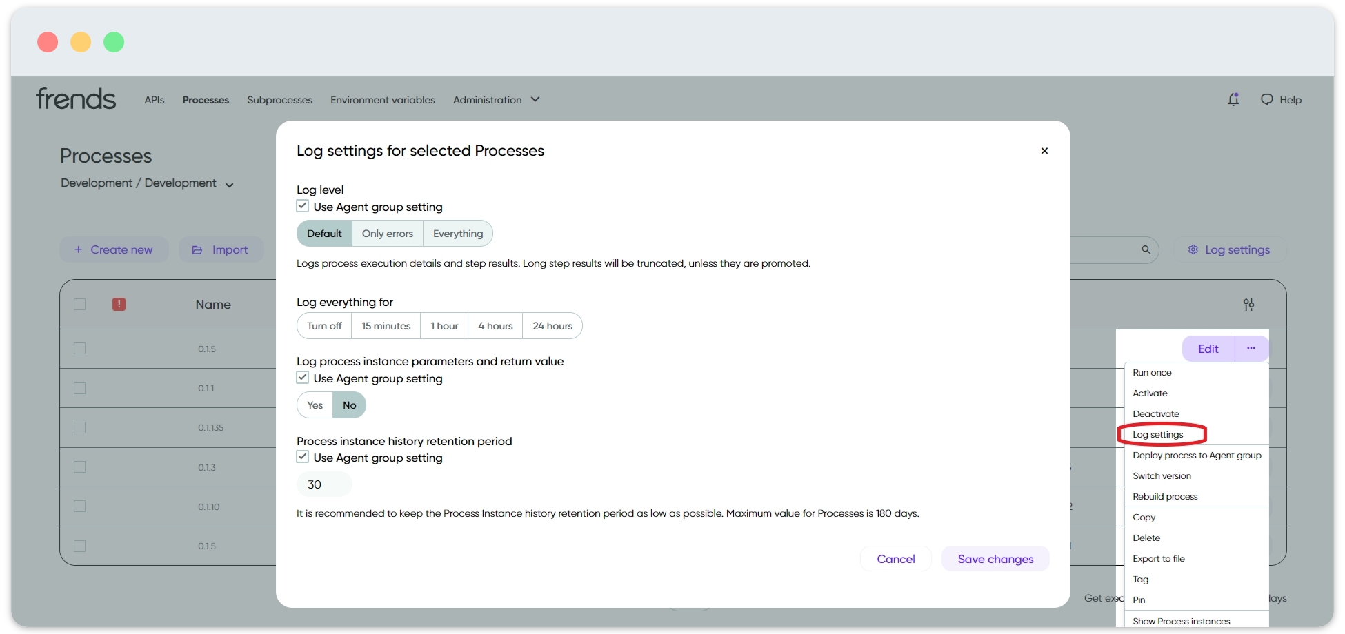 You can configure what information is logged for each execution of a Process, and how long the data is retained. You define these Process log settings per Agent Group. You can also override the Agent Group level settings per Process if needed.