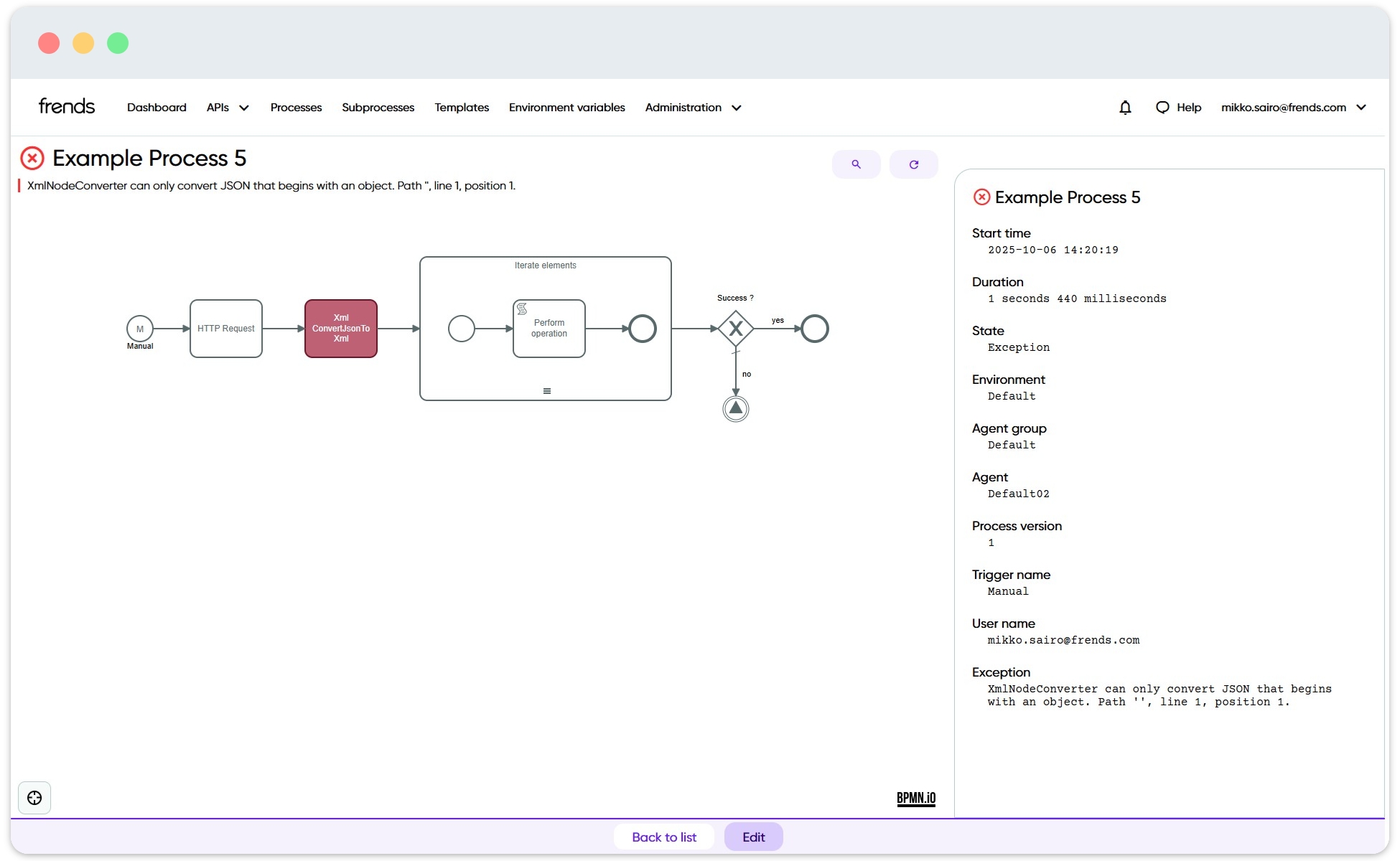 To prevent the log database size from growing uncontrollably, the Frends Log Service periodically deletes old Process Instances from the storage. By default, any Process Instances older than 14 days will be deleted, but you can set the retention period for a specific Agent Group or individual Processes as needed.