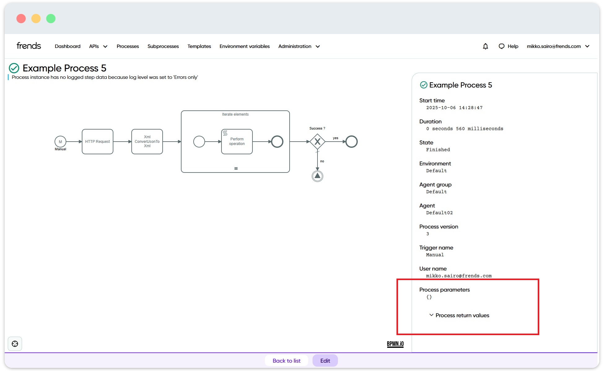 However, you may still be interested in logging the complete request and response data for the Process, e.g., for internal auditing purposes. To do this, you can turn on the "Log Process parameters and return value" option from the log settings.