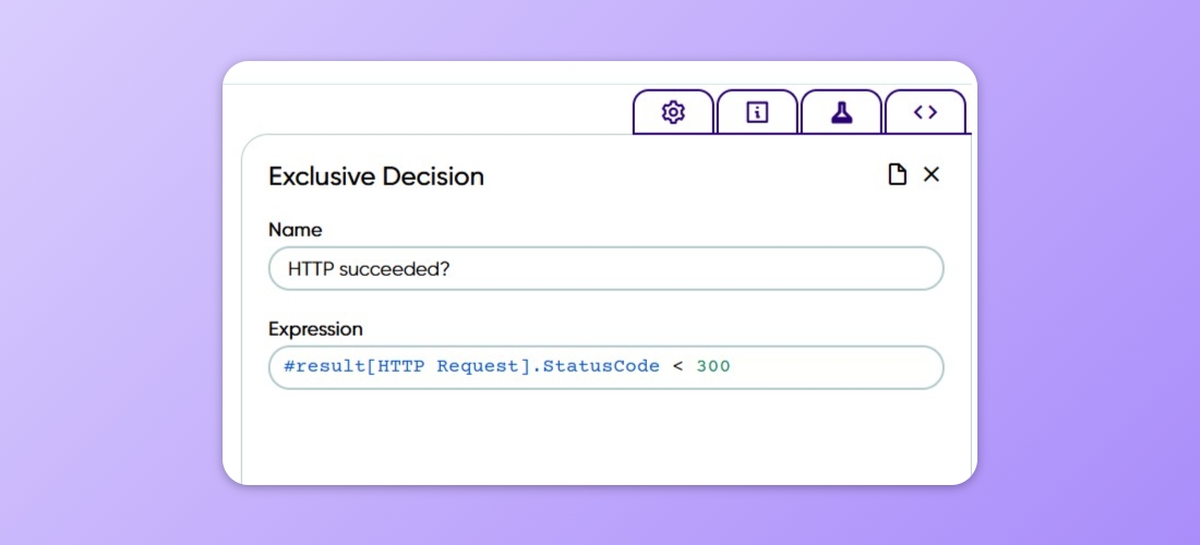 Exclusive Decision and each branch of Inclusive Decision expect an expression to be provided that results in a boolean value. The expression fields for these are locked to requiring C# expression to be given instead of textual or Handlebars input. Validation will also be performed on these fields to make sure the expression results in a boolean value.