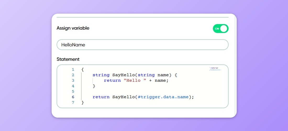 When using the Code Task to assign a value to variable, the code contents must use return statement to save the value to a variable. If variable assignment is not enabled, the code should not return a value, but instead act as a void function. Assignment to existing variables using #var references is possible, but for general readability, this is not recommended and the assign variable option should be used instead.