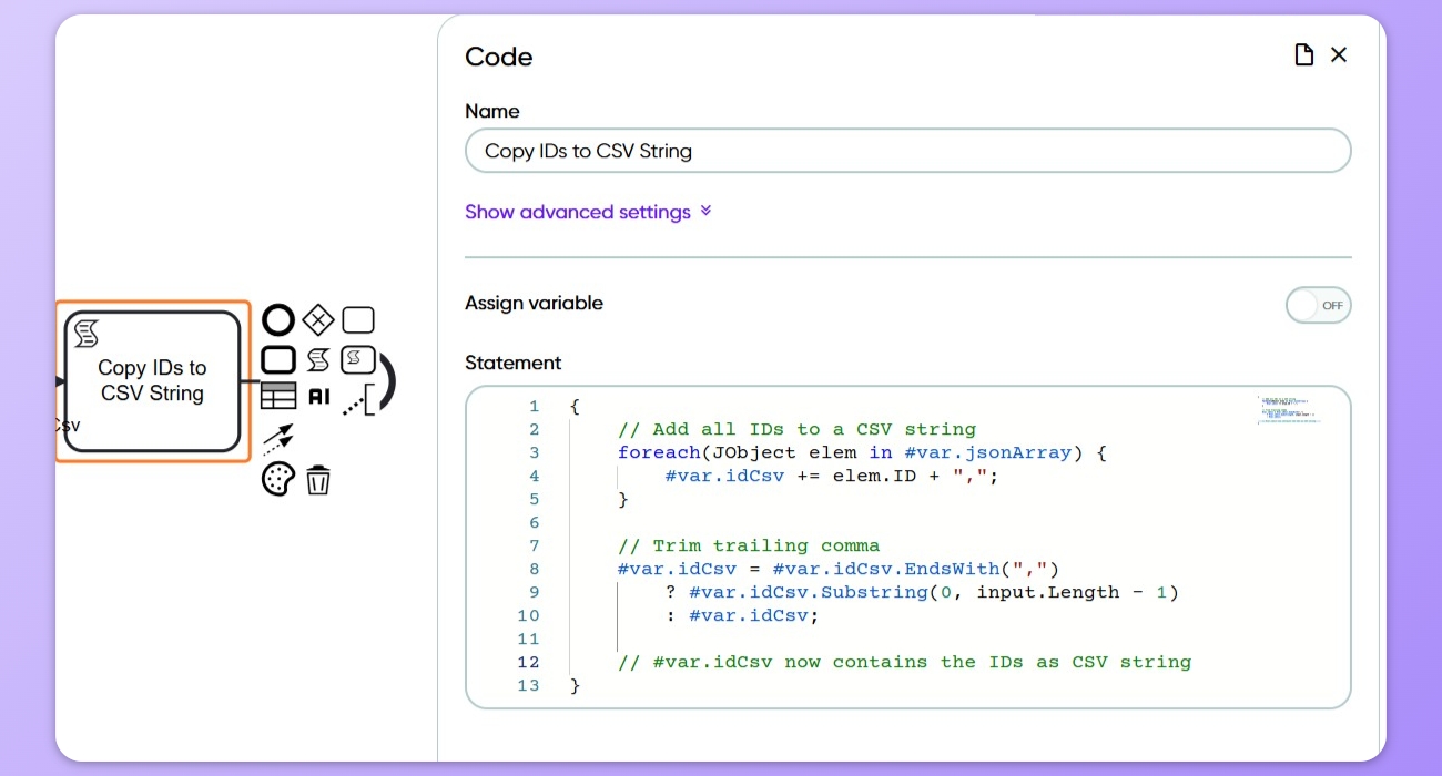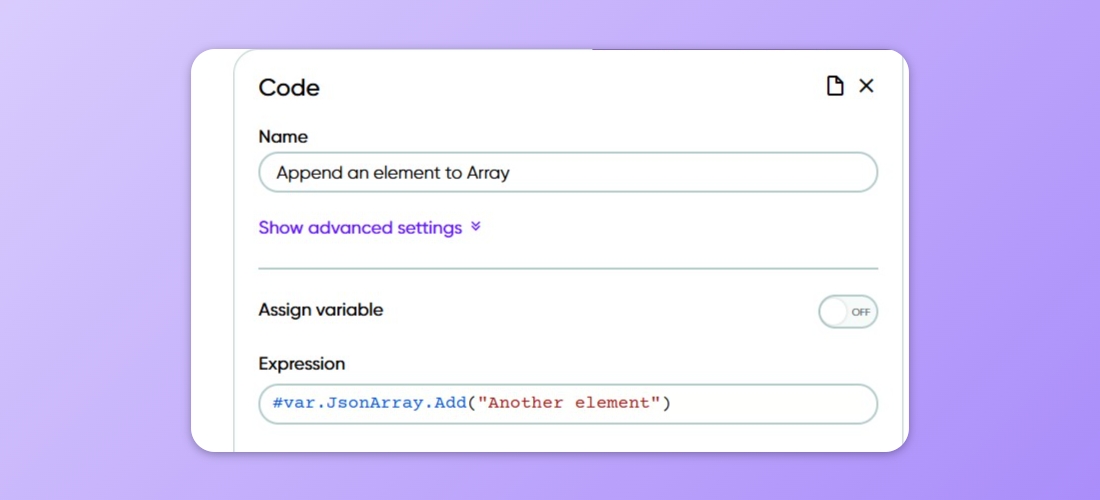 Assign Variable shape's expression field is by default an expression input field, where a single C# expression can be provided and its value is assigned to the variable specified in the shape.