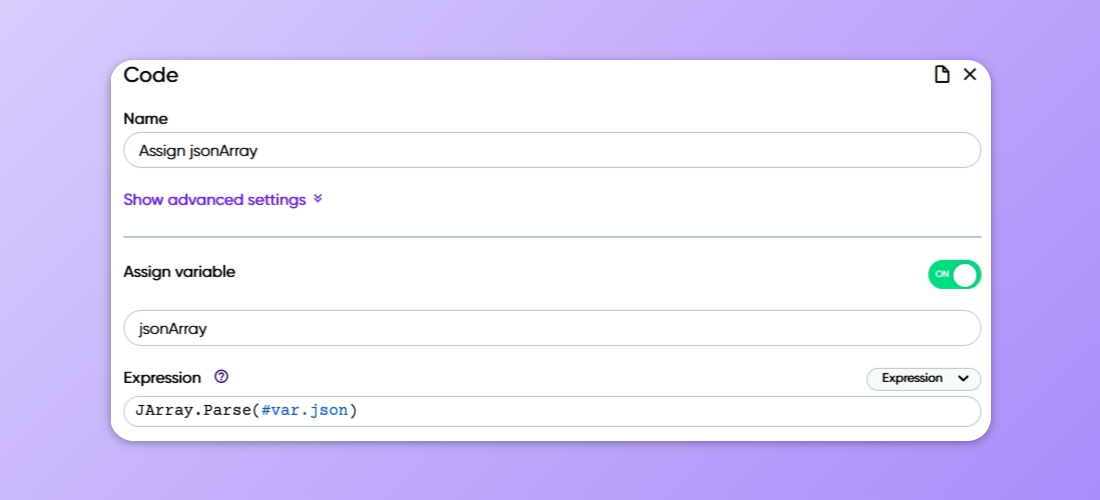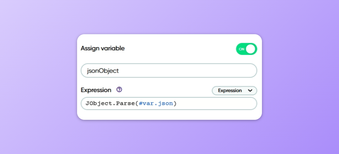 The second way is to use the static method JObject.Parse() in a C# Assign Variable shape, in which you pass the JSON string as a parameter. You can then save the created JObject to a variable.