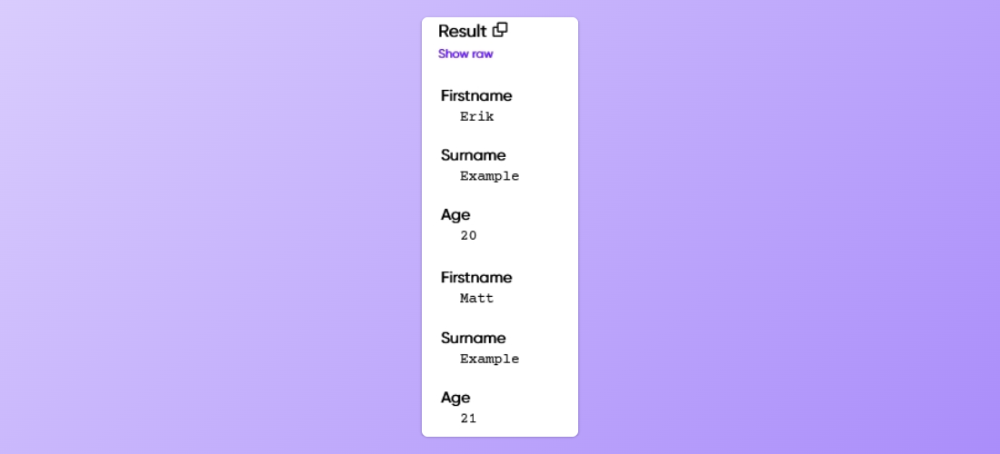 Sometimes the JSON data contains multiple objects that we need to handle. Lets say that we would have some JSON data containing multiple person objects that we processed in the example above. Below is an example of such JSON data, which we save to a variable.