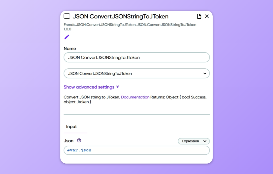 We can then parse this JSON string to a JObject in two ways: using a ConvertJsonStringToJToken Task or the static JObject class method Parse. With a ConvertJsonStringToJToken Task you can pass the JSON string to the Task as a parameter and the result of the Task will be a JToken, which is a parent of the JObject class and behaves in mostly the same way as a JObject.