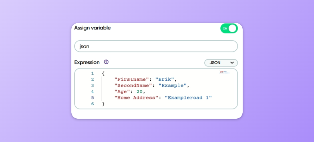 Here we have JSON data which has three keys: FirstName, SecondName and Age with values Erik, Example and 20. We save this value into a variable named "json". Behind the scenes this is a JSON string.