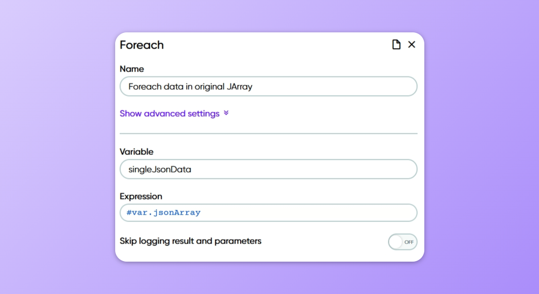 Since a JArray is basically an array of objects, we can also iterate the array using a Foreach shape. Below is an example of a Foreach shape's parameters, in which we iterate through the JArray that we created before and we save each of the values into a variable named "singleJsonData" in each iteration.