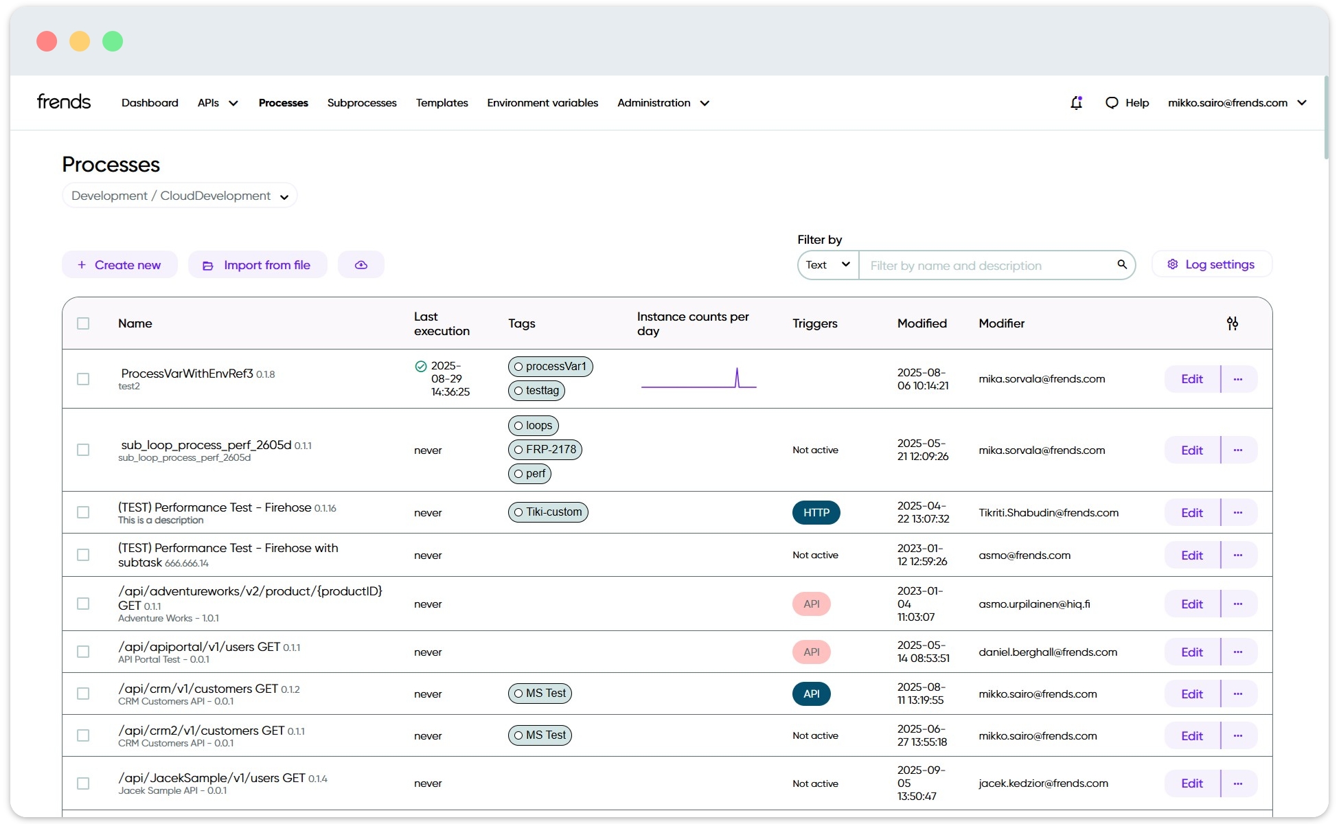 Processes can be created through Processes view in Frends. The view itself lists all the Processes created in your Frends Tenant, in the chosen Agent Group. Development Environment and Agent Group are usually the default selection, where all Process development is also done before deploying the Processes to other Agent Groups. Thus, the default Development Agent Group also includes all the Processes created in your Frends Tenant.