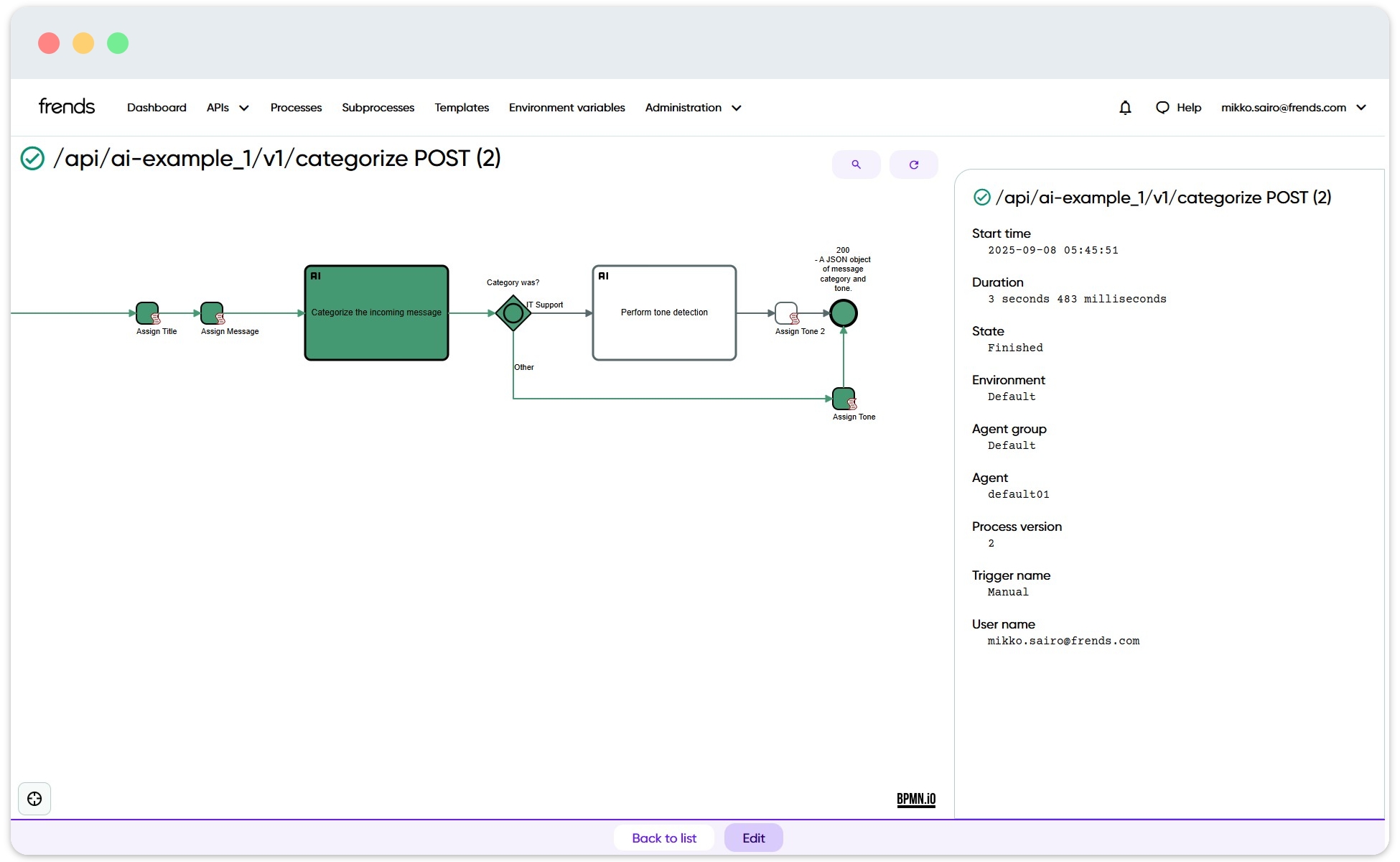 When a Process is created, it is converted into C# code and compiled using .NET. The .NET platform is used to run both the Frends Agent as well as the Processes triggered by the Agent. Processes are executed in their own execution context by the Agent, but running in the same .NET runtime instance as the Agent.