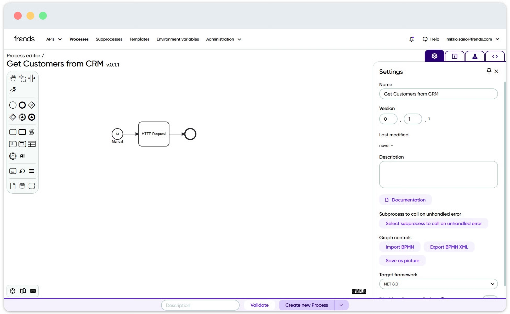 Processes are built using BPMN 2.0 notation that is enhanced with C# programming. Frends includes a subset of BPMN 2.0 notation in the Process Editor, providing key shapes to creating cohesive process flows that are easy to understand by both non-technical personnel as well as for developers.