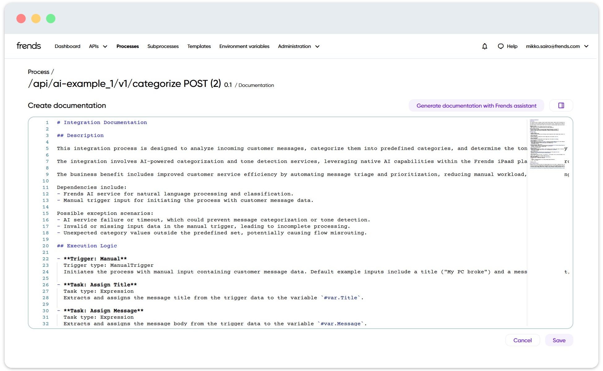 Frends provides a built in method to create and save documentation for each Process. Markdown formatting can be used to write the documentation, and Frends AI Assistant can be used to generate the documentation automatically.